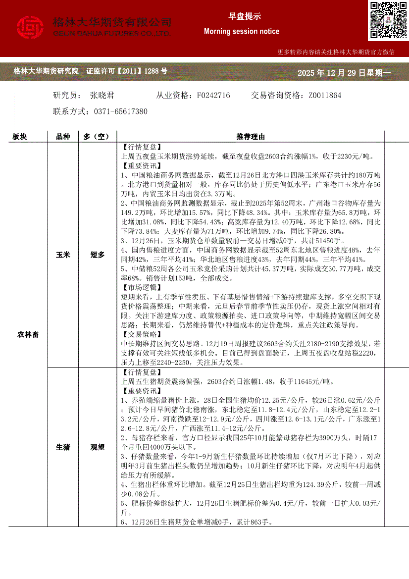 格林大华期货-早盘提示:玉米,生猪,鸡蛋-251225