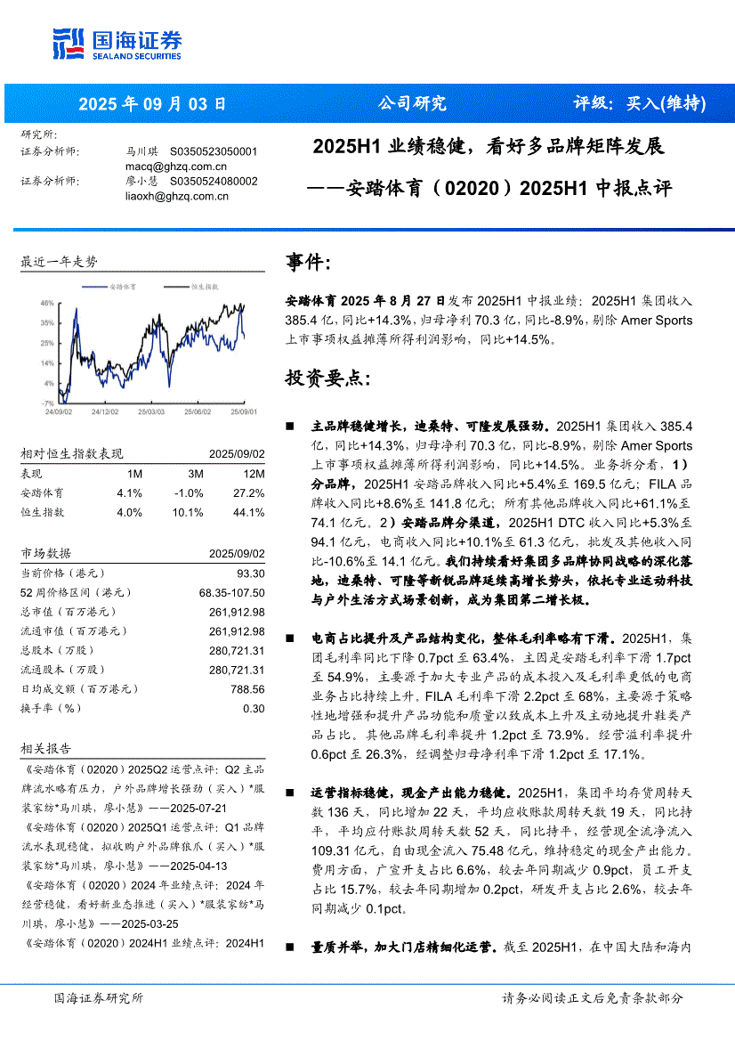 安踏体育:国海证券-安踏体育-2020.HK-2025H1中报点评:2025H1业绩稳健,看好多品牌矩阵发展-250903