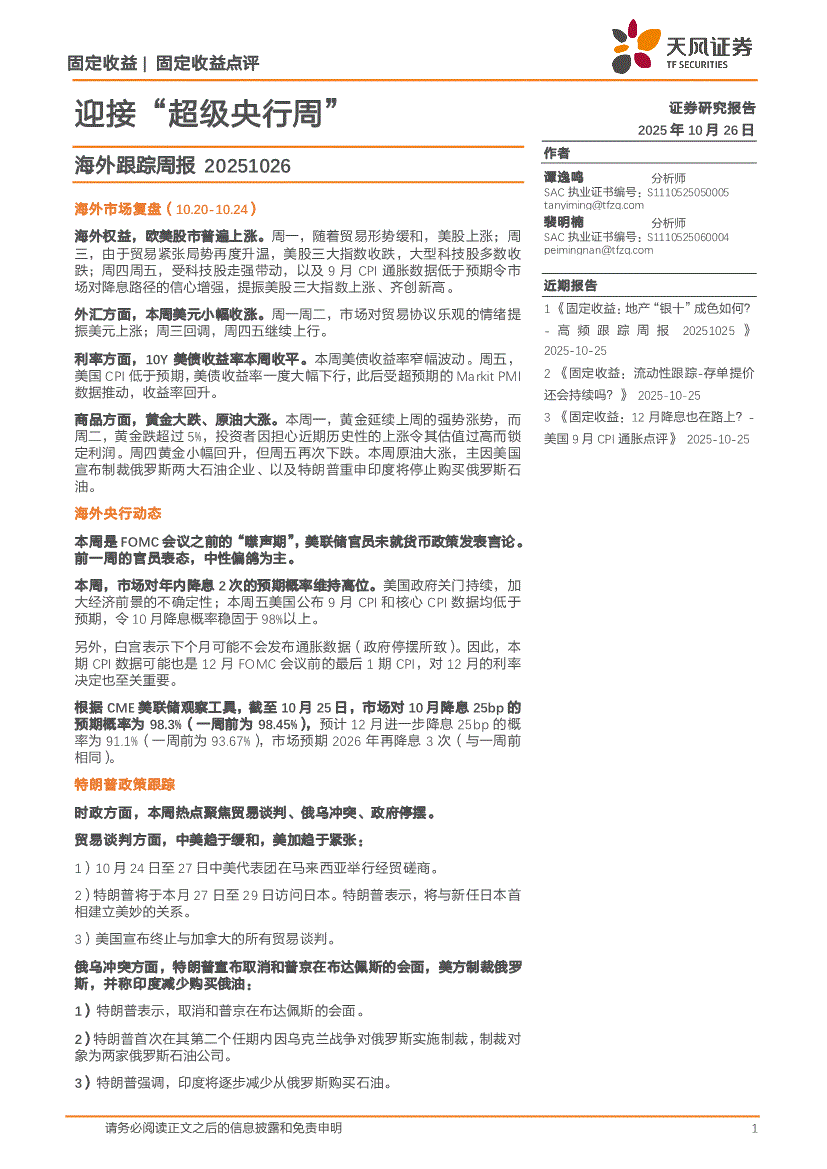 天风证券-海外跟踪周报:迎接“超级央行周”-251026
