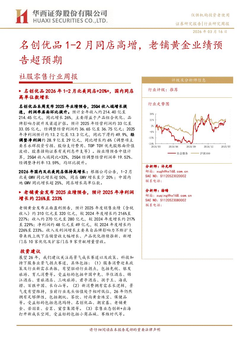 社服零售行业:华西证券-社服零售行业周报:名创优品1~2月同店高增,老铺黄金业绩预告超预期-260316