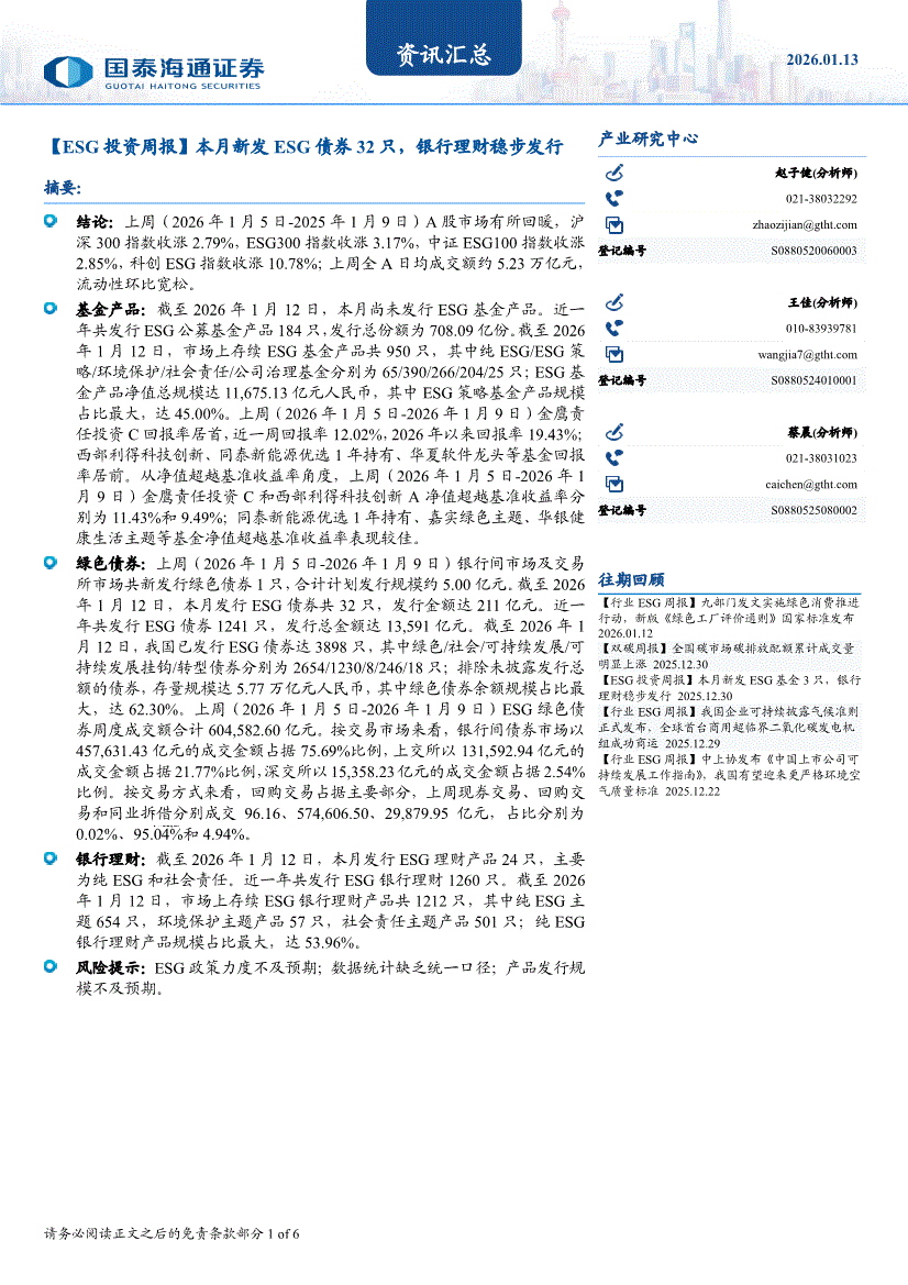 国泰海通证券-资讯汇总:【ESG投资周报】本月新发ESG债券32只,银行理财稳步发行-260113
