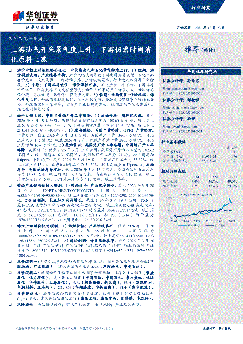 石油石化行业:华创证券-石油石化行业周报:上游油气开采景气度上升,下游仍需时间消化原料上涨-260323