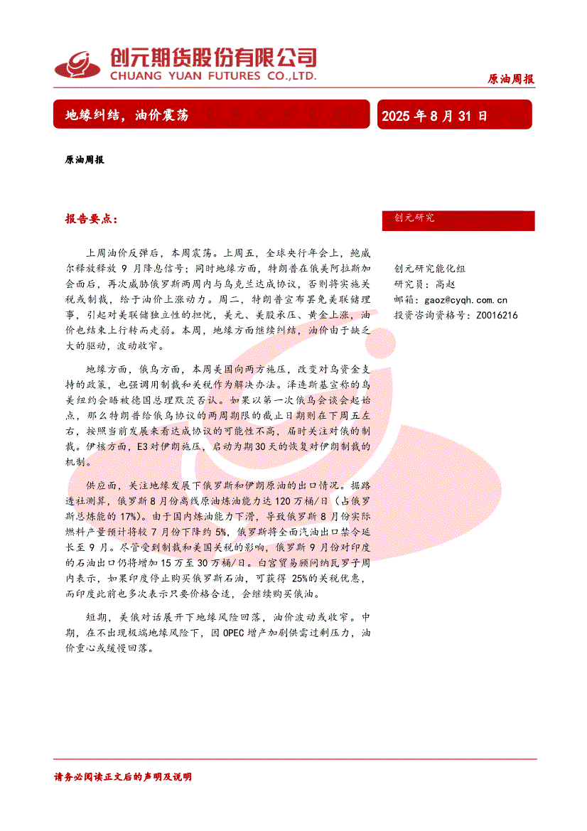 创元期货-原油周报:地缘纠结,油价震荡-250831