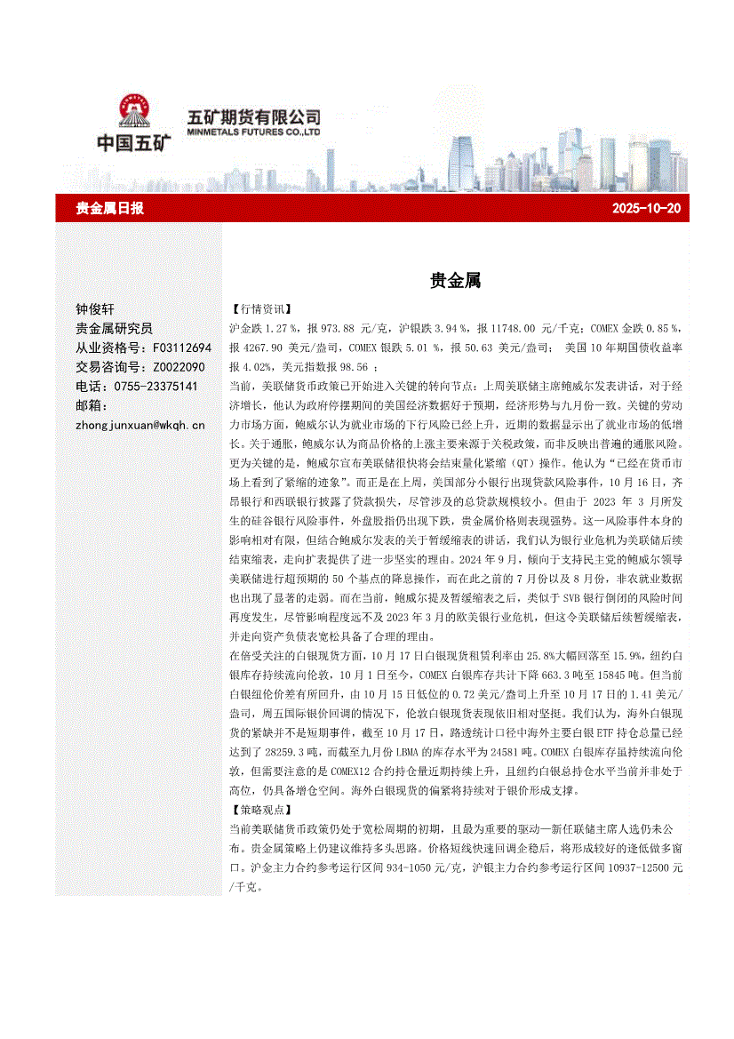 五矿期货-贵金属月报:现货驱动明显,等待价格充分回调-251010