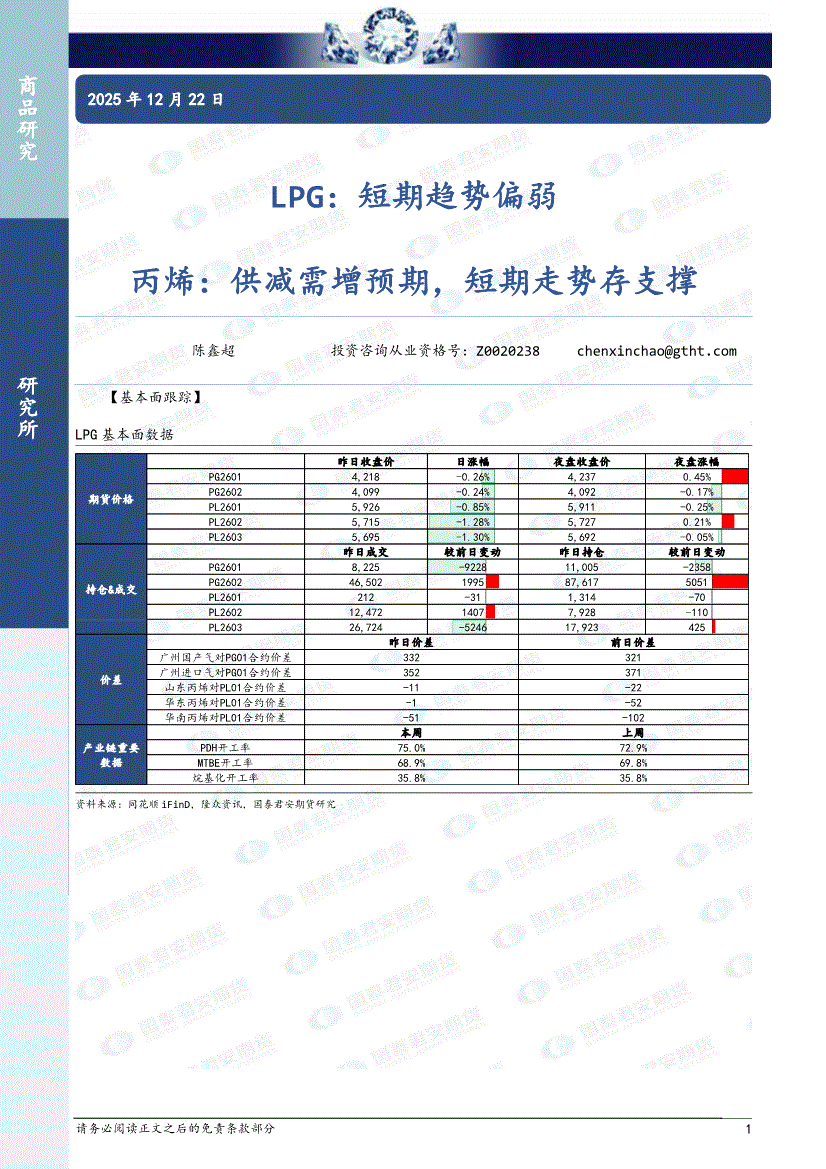 国泰君安期货-LPG:短期趋势偏弱,丙烯,供减需增预期,短期走势存支撑-251222