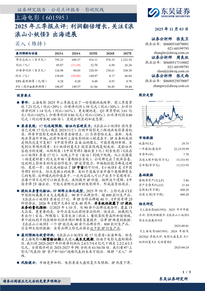 上海电影:东吴证券-上海电影-601595-2025年三季报点评:利润翻倍增长,关注《浪浪山小妖怪》出海进展-251103