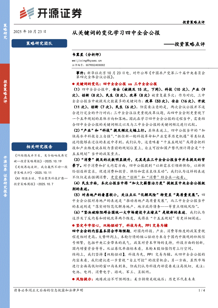 开源证券-投资策略点评:从关键词的变化学习四中全会公报-251023