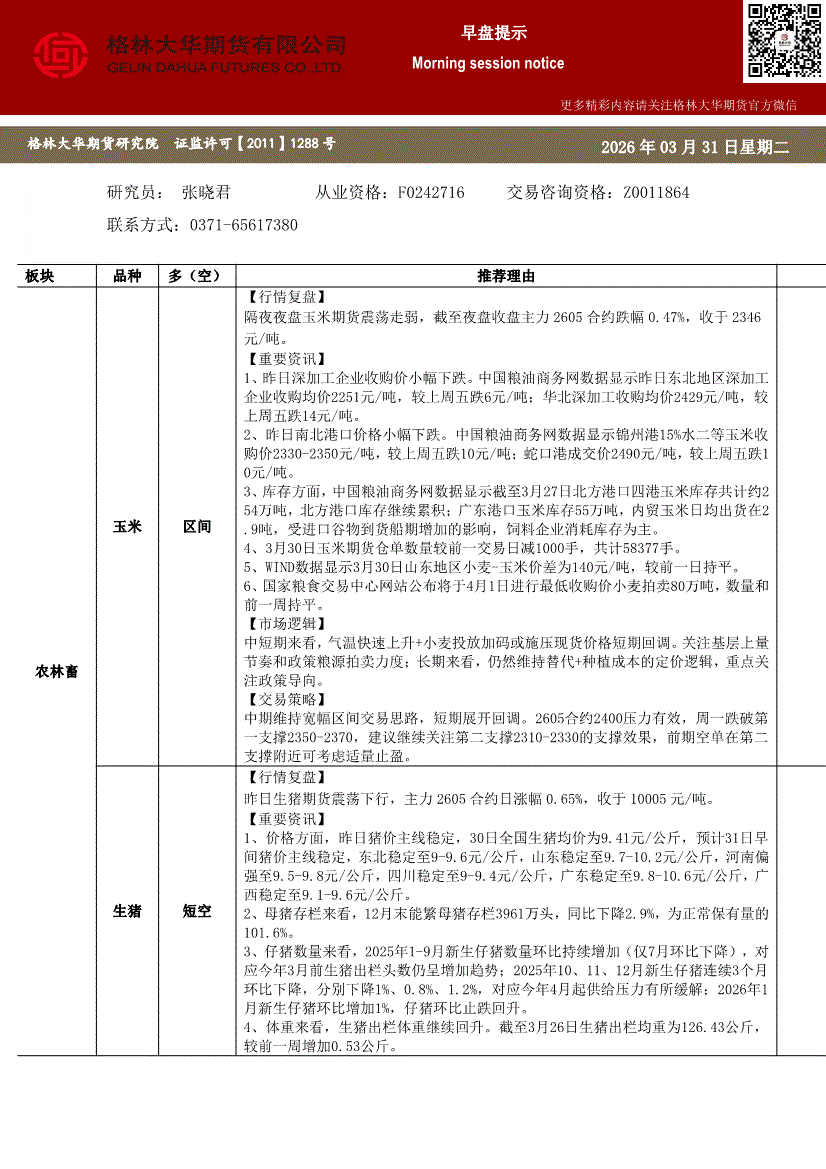 格林大华期货-早盘提示:玉米生猪鸡蛋-260331
