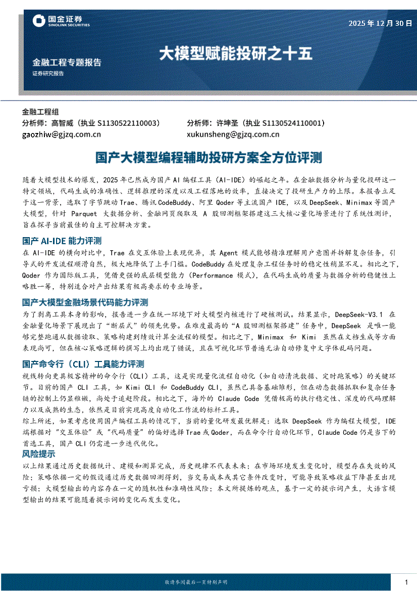 国金证券-大模型赋能投研之十五:国产大模型编程辅助投研方案全方位评测-251230