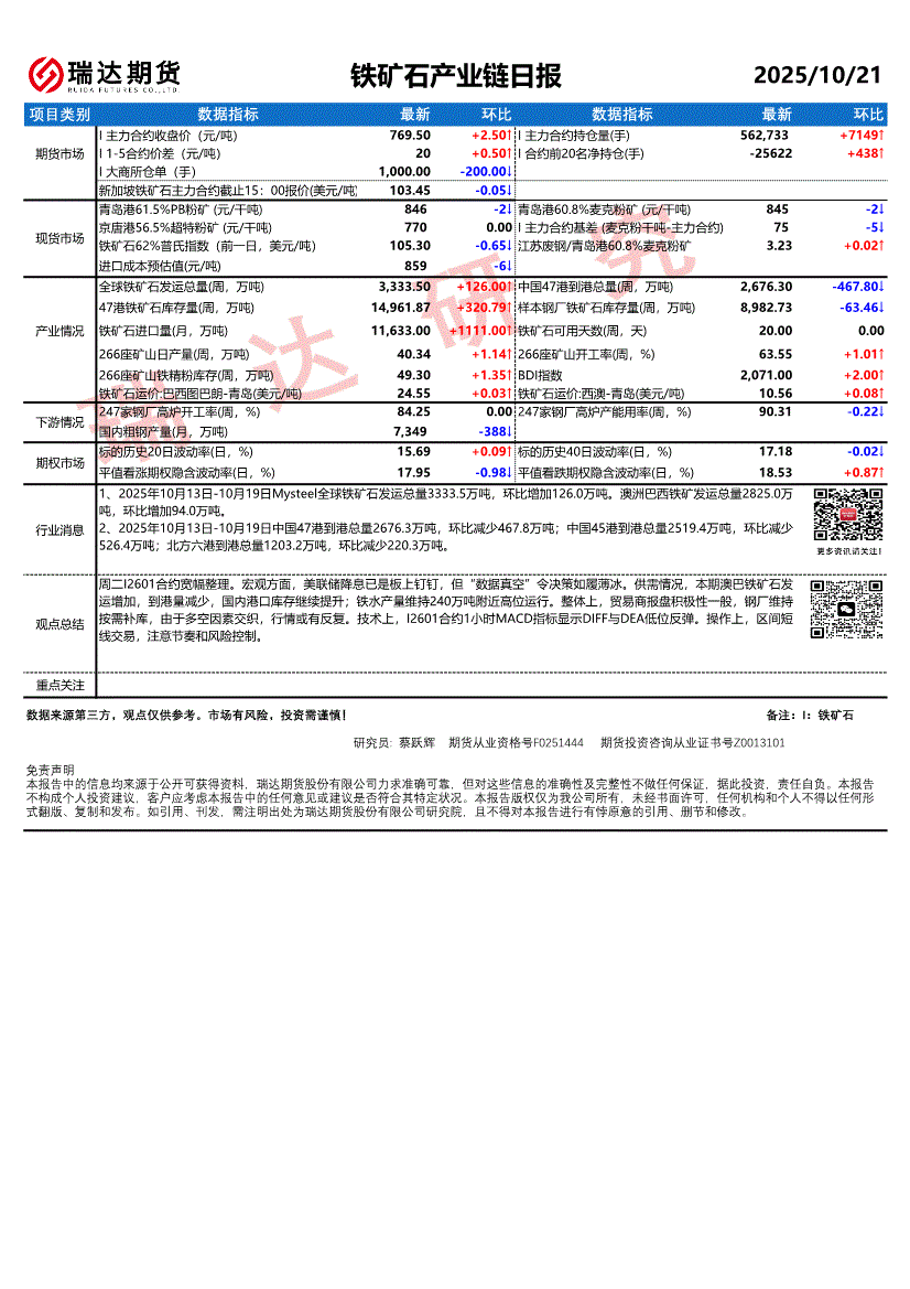 瑞达期货-铁矿石市场周报:铁水产量高位运行,铁矿期价反弹-251010