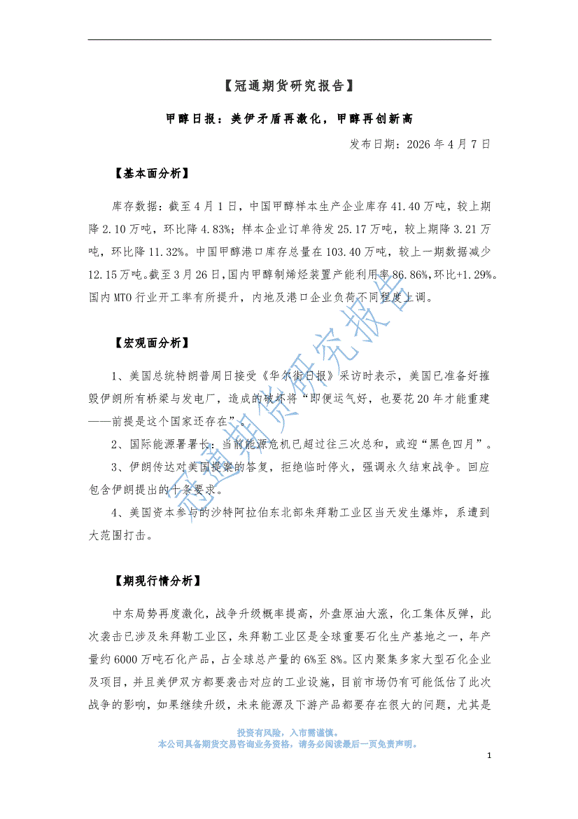 冠通期货-甲醇日报:美伊矛盾再激化,甲醇再创新高-260407