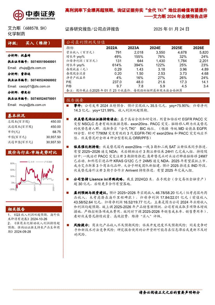 艾力斯:中泰证券-艾力斯-688578-2024年业绩预告点评:高利润率下业绩再超预期,询证证据夯实“全代TKI”地位后峰值有望提升-250124