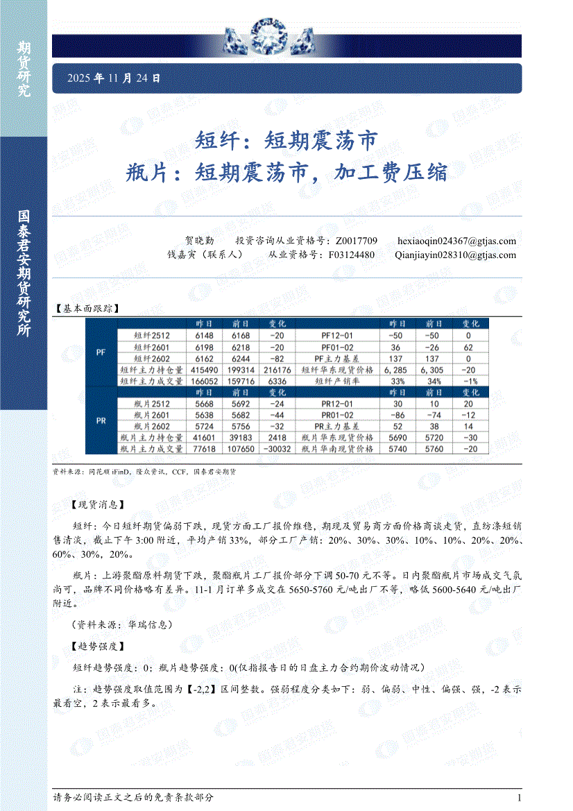 国泰君安期货-短纤:短期震荡,中期有压力,瓶片,短期震荡,中期有压力-251128