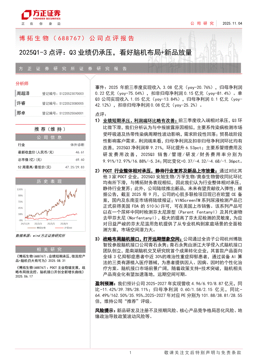 博拓生物:方正证券-博拓生物-688767-2025Q1~3点评:Q3业绩仍承压,看好脑机布局+新品放量-251104