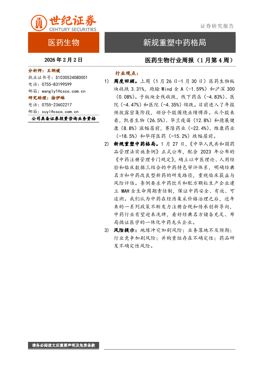 医药生物行业:世纪证券-医药生物行业周报(1月第4周):新规重塑中药格局-260202