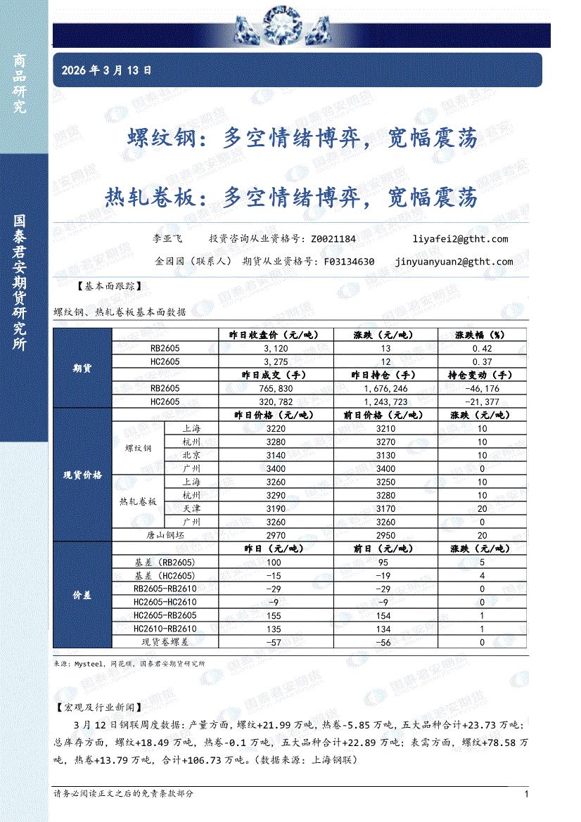 国泰君安期货-螺纹钢:多空情绪博弈,宽幅震荡,热轧卷板,多空情绪博弈,宽幅震荡-260313