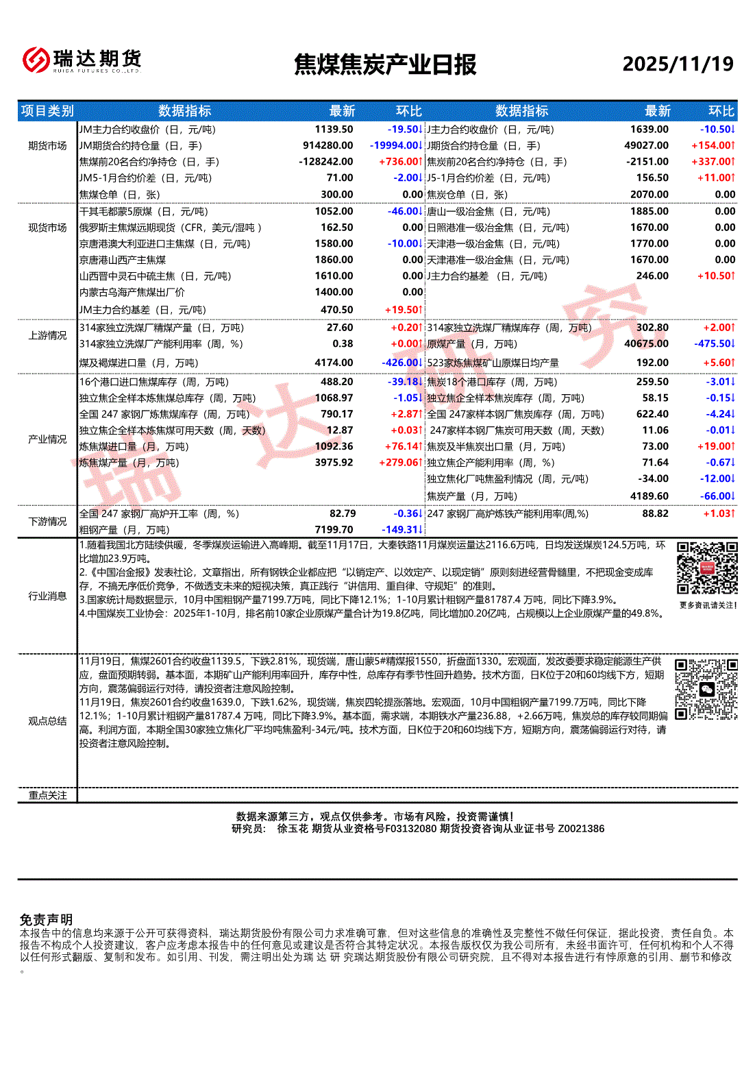 瑞达期货-焦煤市场周报:宏观稳产&供应回升,焦煤期价短期偏弱-251114