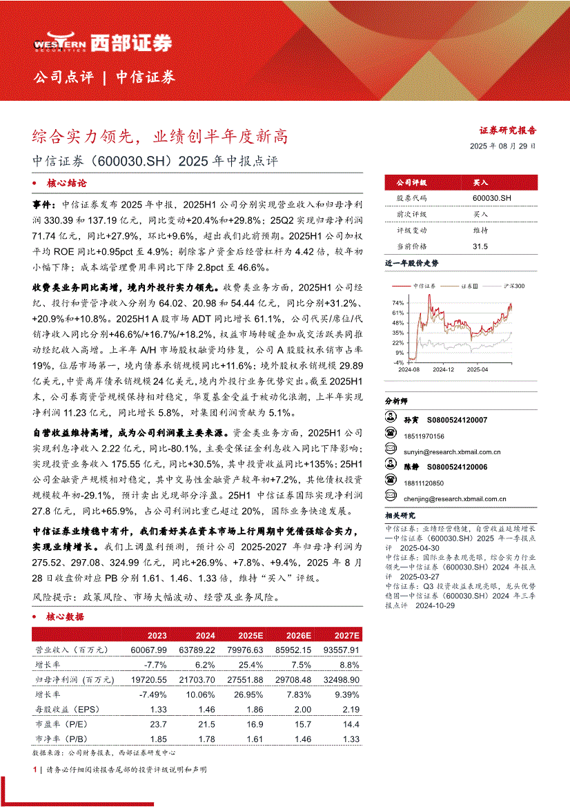 中信证券:西部证券-中信证券-600030-2025年中报点评:综合实力领先,业绩创半年度新高-250829