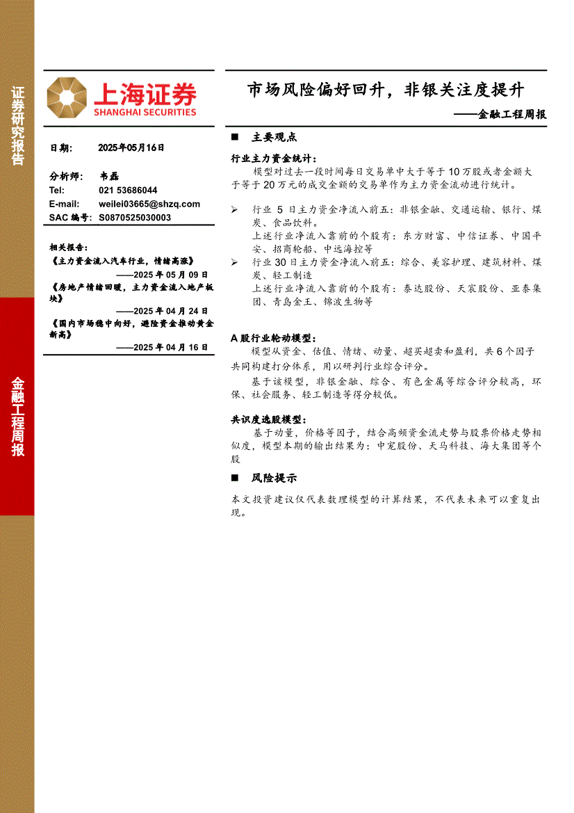 上海证券-金融工程周报:市场风险偏好回升,非银关注度提升-250516