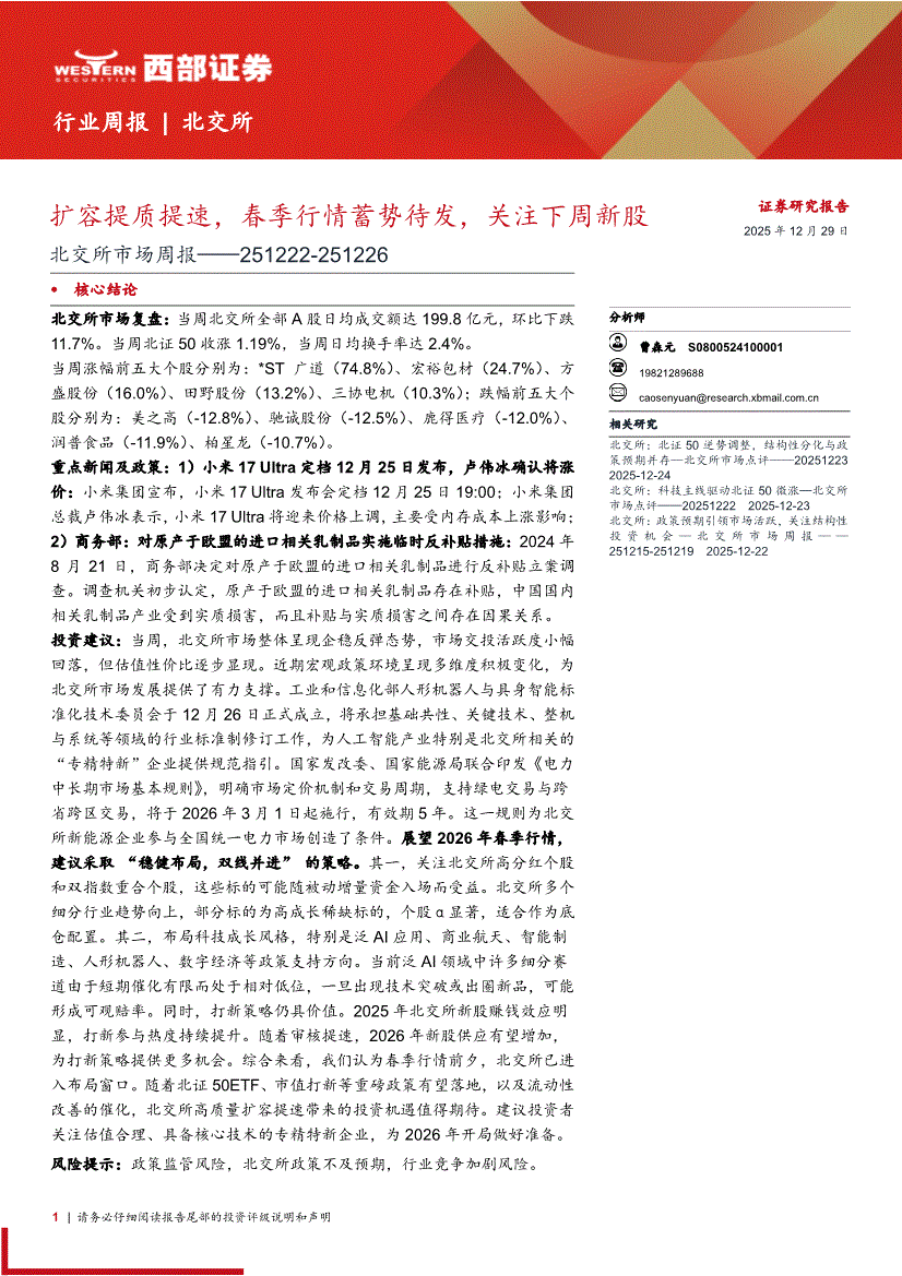 西部证券-北交所市场周报:扩容提质提速,春季行情蓄势待发,关注下周新股-251229