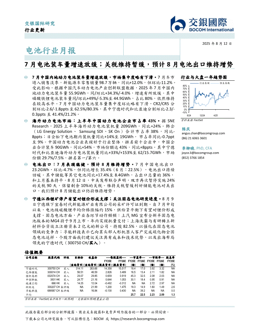 电池行业:交银国际-电池行业月报:7月电池装车量增速放缓;关税维持暂缓,预计8月电池出口维持增势-250812